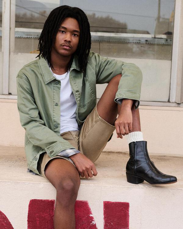 Utility influences continue through spring with durable fabrics and practical details. Workwear-inspired pieces like relaxed trousers, chore jackets, field shirts, and classic denim jackets focus on function and wearability. Camo appears as an easy, neutral option across wide legs, relaxed straights, long shorts, and boyfriend fits.
